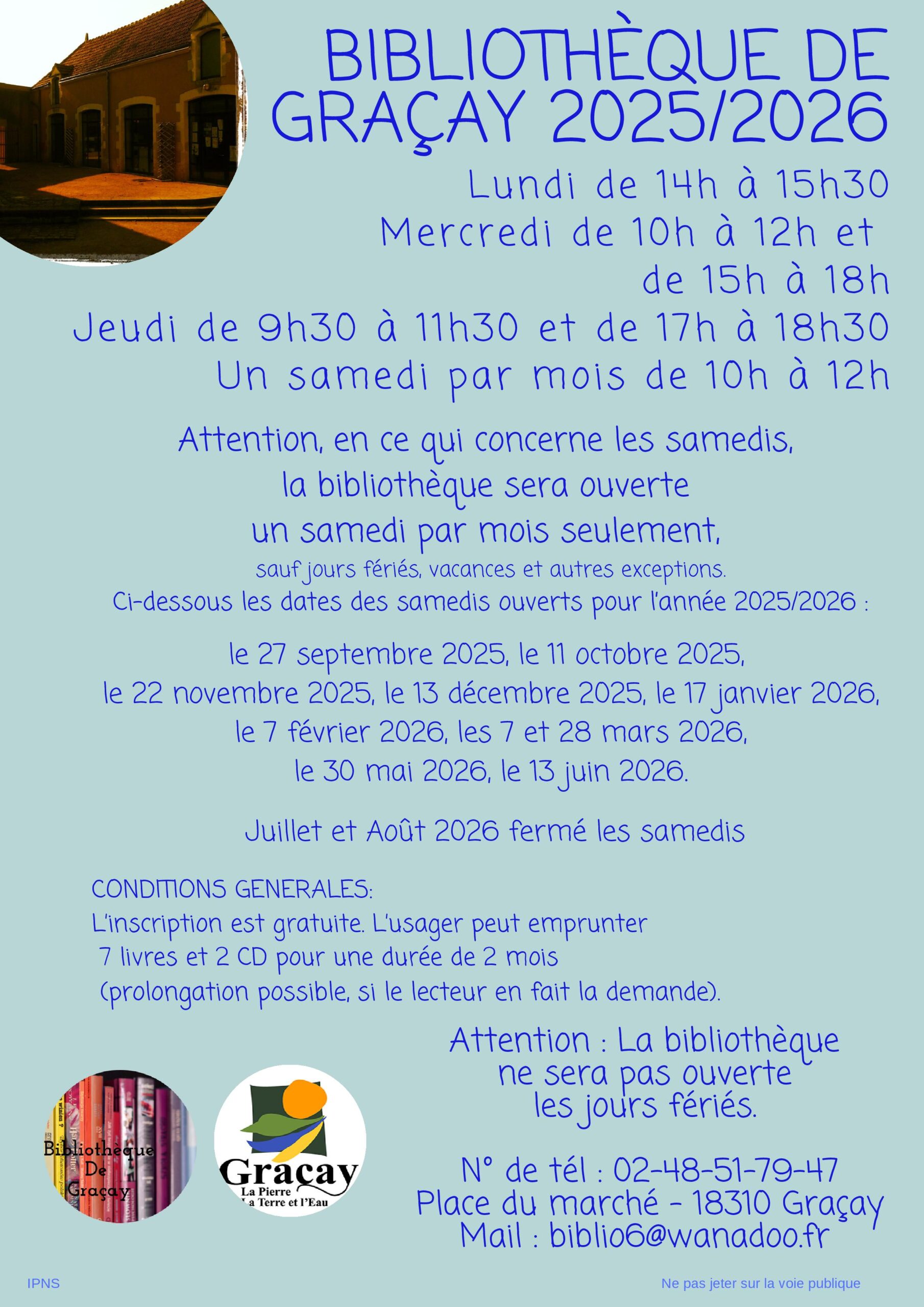 Les horaires et le calendrier d'ouverture de votre bibliothèque sont disponibles ICI.